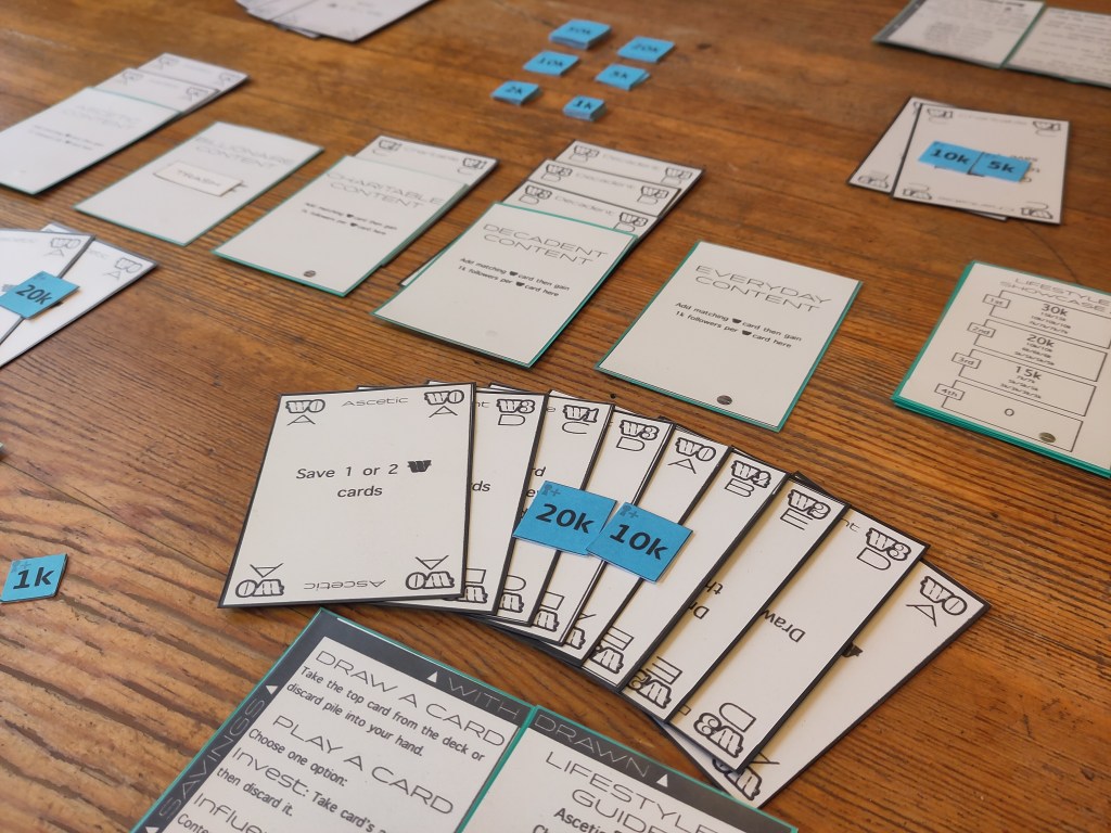 This is a collaboration with Wendy Miasma to coincide with the release of an EP of five songs. It’s a card game in which you play as lifestyle influencers competing in a straight-to-VHS reality show to promote WENDYBUXXX, the world’s first necrocurrency. Create content to manipulate the popularity of different lifestyles, and manage your money to fit into the right lifestyle bracket at the right time. Whoever has the most followers at the end wins!